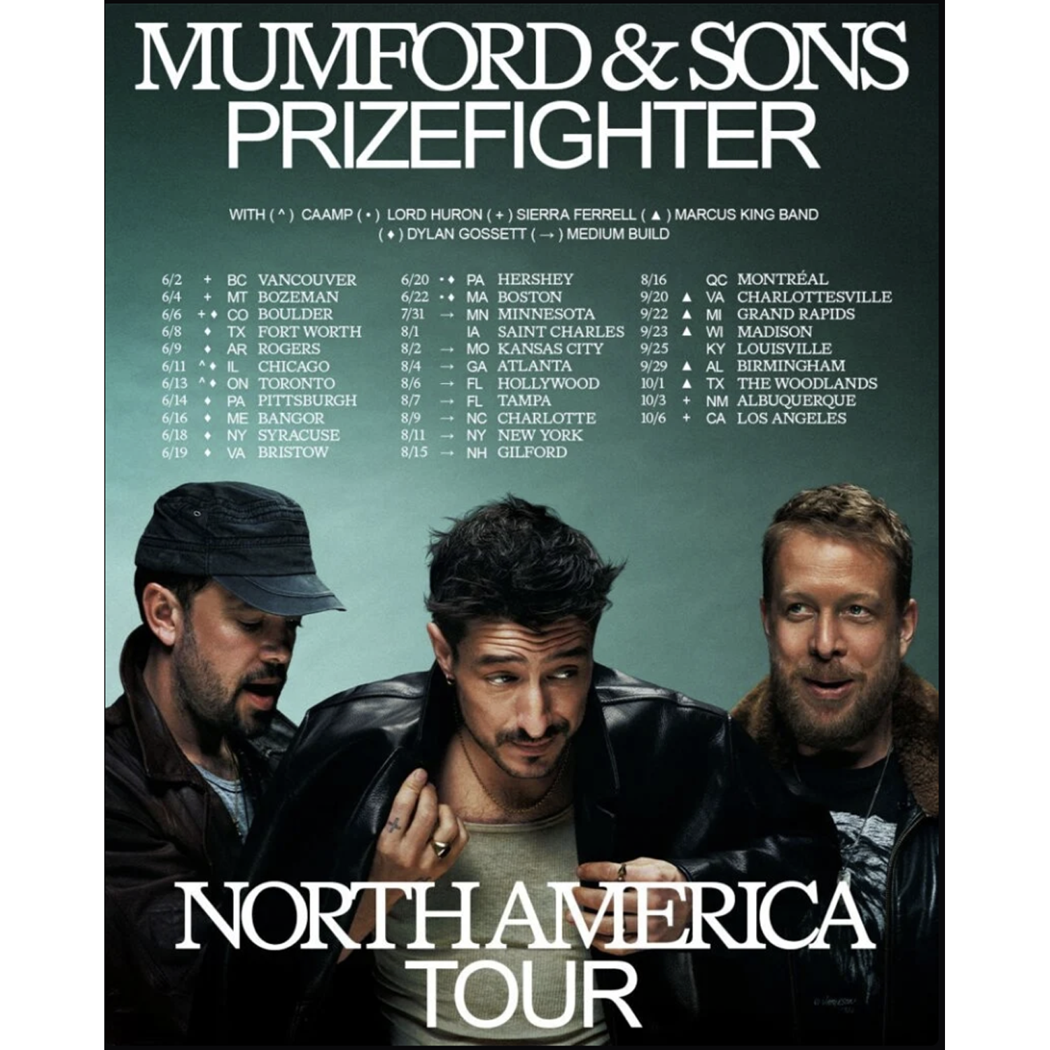 || with special guest Sierra Ferrell † with special guests Sierra Ferrell and Dylan Gossett ‡ with special guest Dylan Gossett # with special guests Caamp and Dylan Gossett with special guests Lord Huron and Dylan Gossett ^ with special guest The War on Drugs ~ with special guest Medium Build % with special guest Marcus King Band